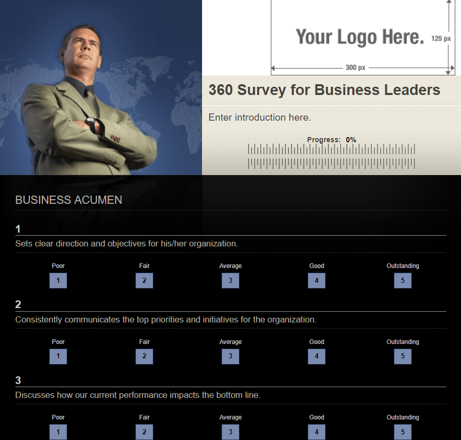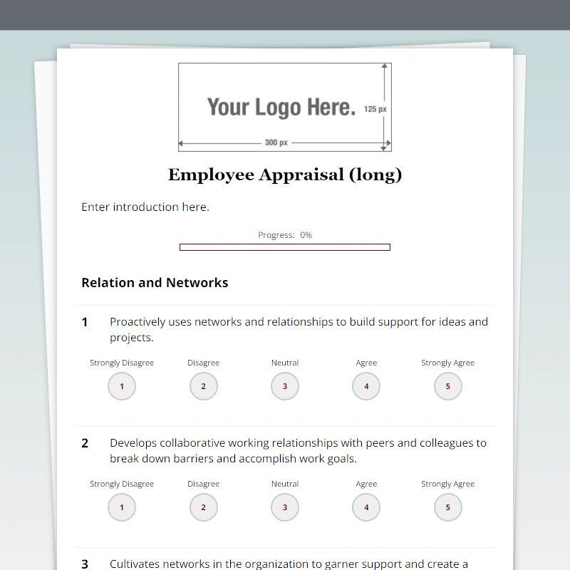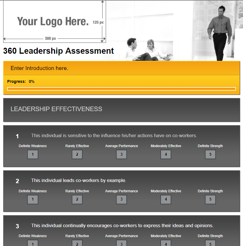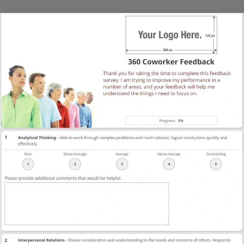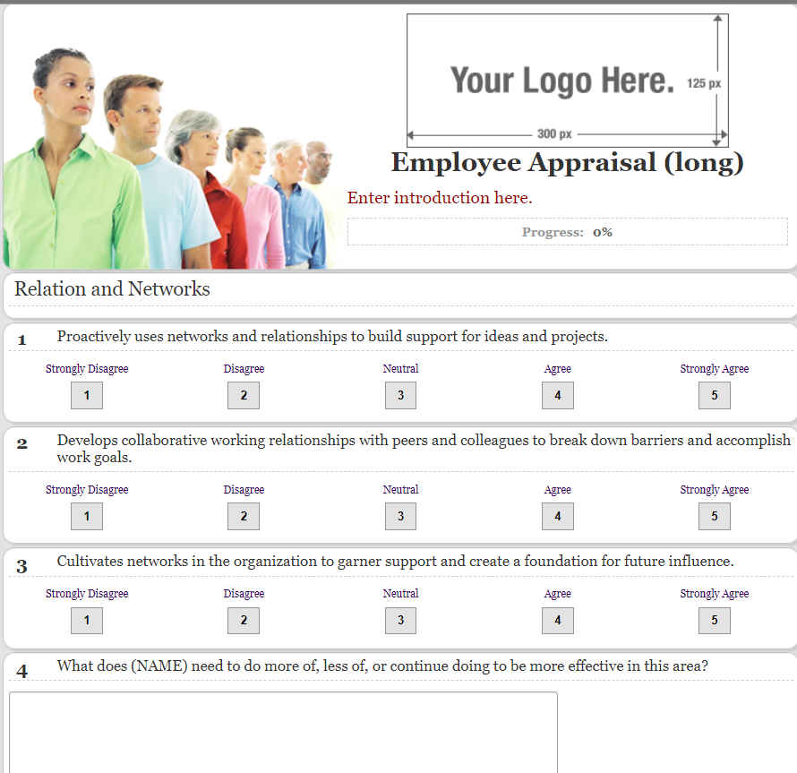 Create a survey from scratch, or copy and/or customize a template from our vast 360 Employee Evaluation Survey Templates library. Then you can make your survey unique by applying any of our graphic skins, uploading your company logo, and changing the colors to match your company’s brand.